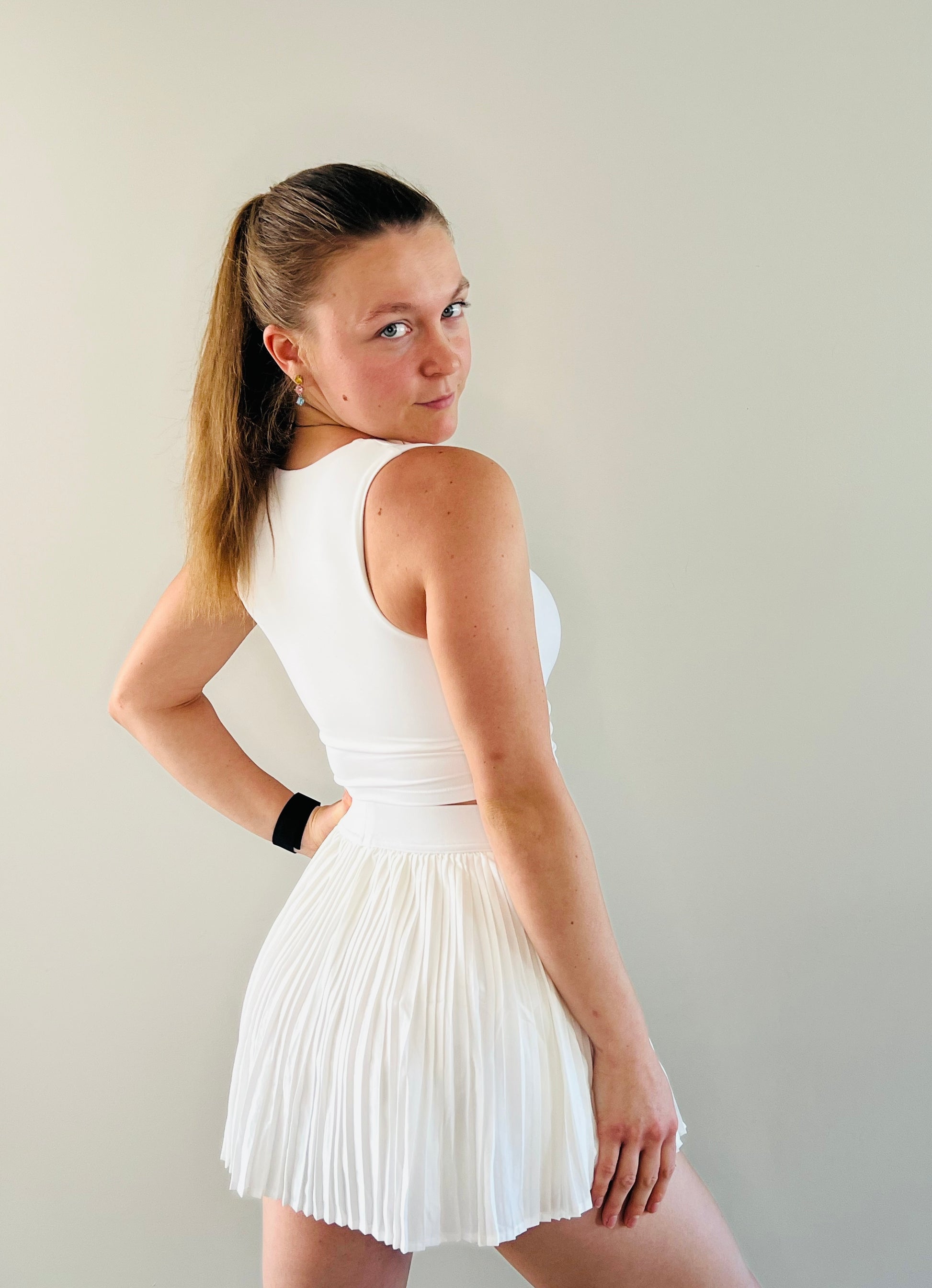 The pleated skirt adds a touch of iconic tennis charm while allowing full freedom of movement, and the matching top offers a sleek, streamlined look that keeps you cool during every serve, volley, and rally. Whether you’re training hard, competing, or styling it off-court, the Ace Set is your perfect match.