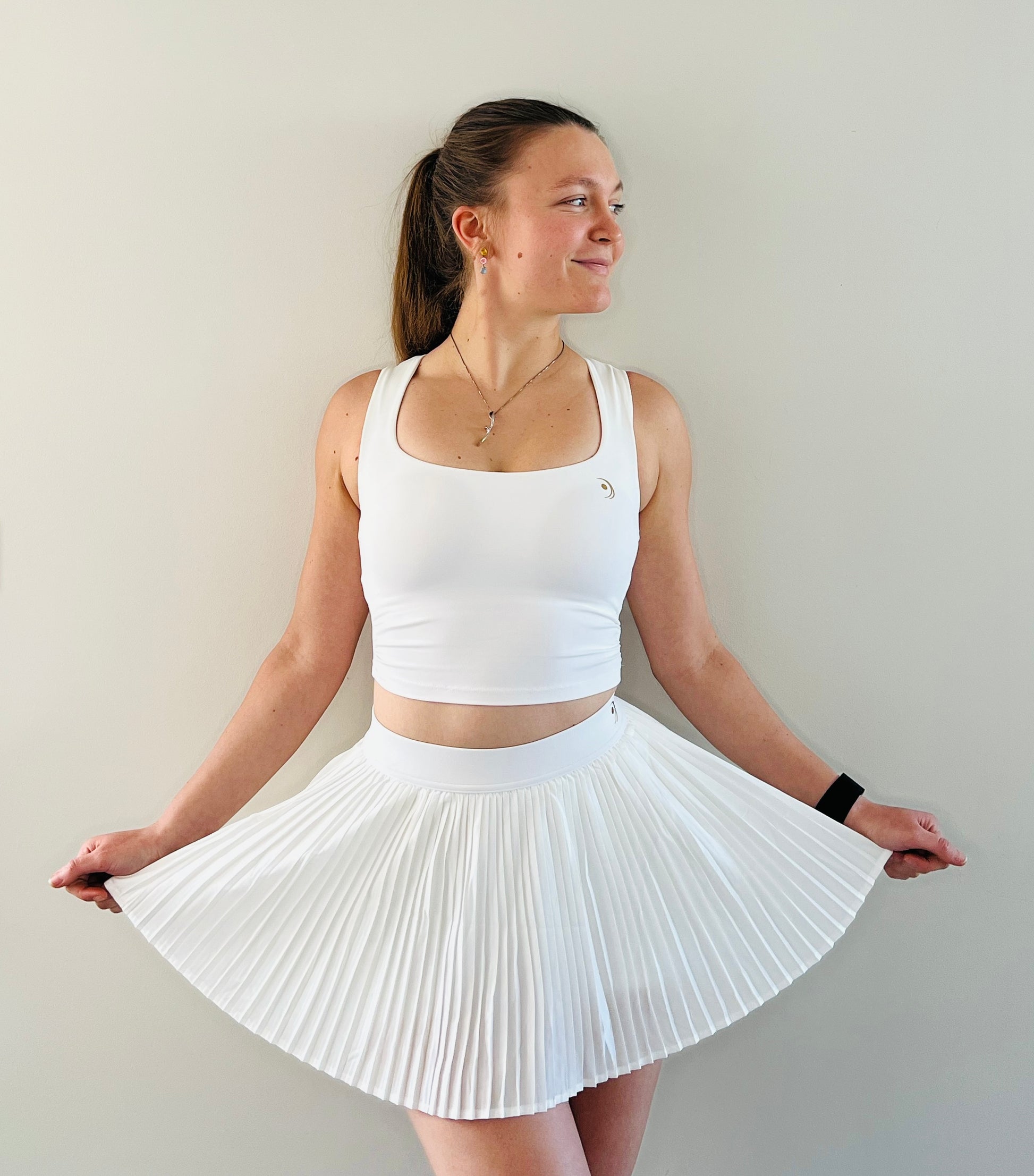 Step onto the court in timeless style with our Ace Court Set, featuring a crisp white top paired with a classic pleated skirt. Designed for both performance and elegance, this set combines breathable, lightweight fabric with a flattering fit that moves effortlessly with you. Accented with a golden logo, representing both victory and a classic look.